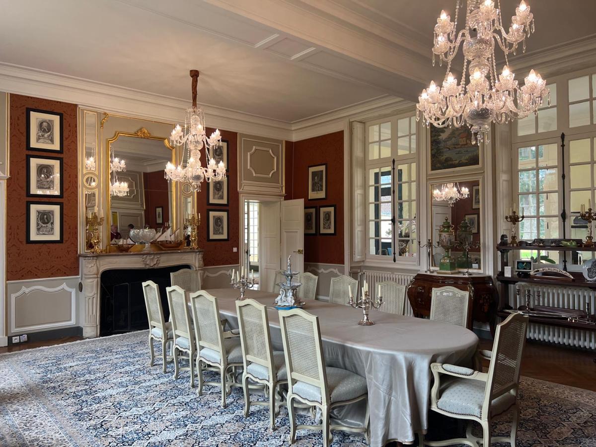 A. Château élevé sur terre-plein, consistant en une grande construction, avec deux ailes parallèles, l’une à l’est, l’autre à l’ouest sur cave. I. La portion principale comprenant : – Au rez-de-chaussée : * dans la partie centrale, un vestibule d’entrée – galerie, donnant sur un hall avec escalier, une salle à manger, un salon – salle de télévision, un deuxième salon, une pièce – cuisine – débarras, un bureau Toutes ces pièces éclairées notamment par des fenêtres au midi sur le parc * dans son aile “Est”, une salle de service – dégagement, desservant : une cuisine aménagée et équipée, une lingerie, une salle de cinéma, un bureau, une entrée donnant elle-même sur un dégagement desservant une salle de sport, une salle de massage, salle d’eau et hammam, et local technique. * dans son aile “Ouest” , un dégagement, couloir avec un local technique – informatique, desservant une grande salle précédemment utilisée comme salle de réunion, au sous-sol, une cave enterrée, local technique et une autre pièce enterrée. Un appartement de service (loge du gardien) comprenant en rez-de-chaussée, séjour, salon, cuisine, WC invités et permettant l’accès à l’étage comprenant trois chambres, salle de bains, avec lavabo, WC et halle d’escalier. – Au premier étage : dans la partie centrale, une chambre avec une salle de bains, WC, lavabo donnant accès au grenier et comprenant le local technique informatique, une chambre avec dressing, une salle de bains, WC, lavabo et deux autres chambres séparées par une salle de bains commune, dégagement – palier d’escalier, menant à une grande pièce sous le plafond mansardé de l’aile ouest – Au deuxième étage : dans la partie centrale : deux chambres avec chacune une salle de bains, wc, lavabo et deux autres chambres séparées par une salle de bains commune, dégagement – palier d’escalier.   Il- Grande cour avec jardin d’agrément entre ces trois corps de bâtiment, à laquelle on accède par une avenue droite gazonnée partant de l’entrée principale de la propriété.   Ill- Château d’eau autrefois alimenté par un bélier hydraulique et maintenant utilité dans le cadre du micro forage nouvellement installé qui fournit toute l’eau pour la maison et l’arrosage des jardins. A côté du château se trouvent des écuries en accès direct aux paddocks et carrière. Le prolongement de l’aile est, ouvrant sur la cour intérieure comprenant un grand porche, des remises, une ancienne écurie, un grenier courant sur toute la longueur de l’aile. Dans cette zone, les jardins paysagers supportent une piscine et un jacuzzi, avec des chemins menant sur une ancienne chapelle convertie comprenant une entrée, une grande salle et une salle d’eau Le parc se compose de bois, prairie, cours, source, cresson, canaux et étang.